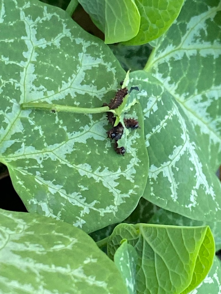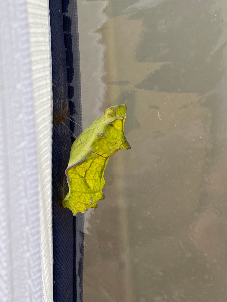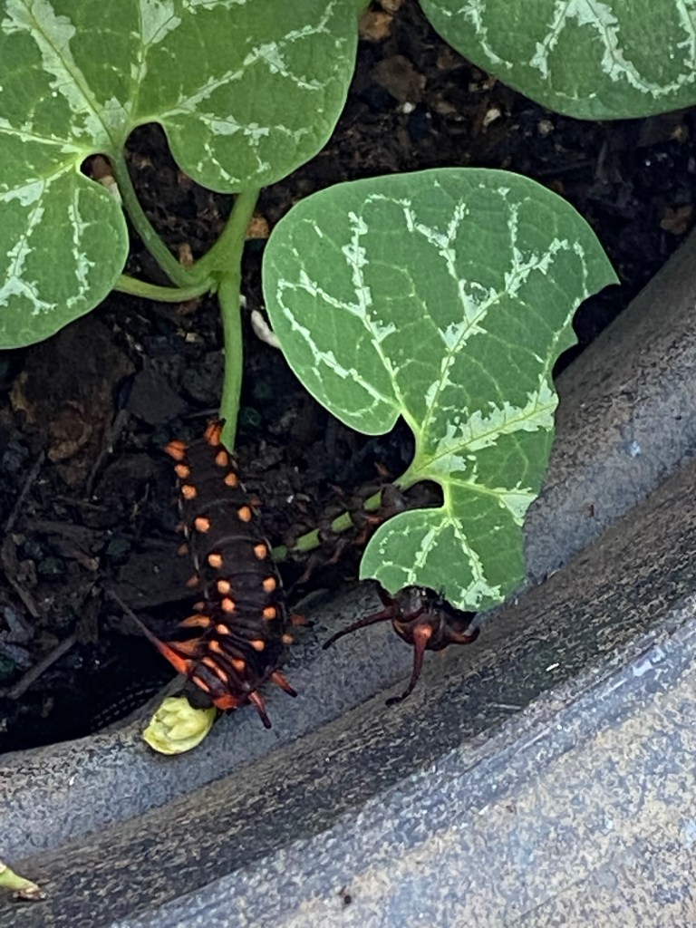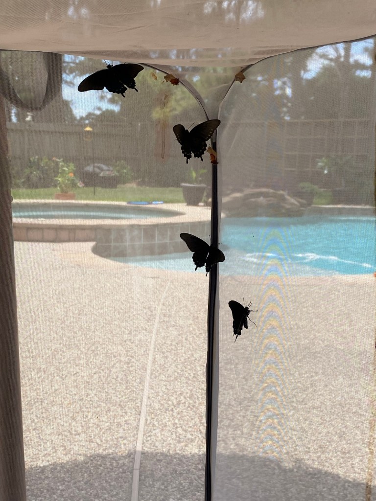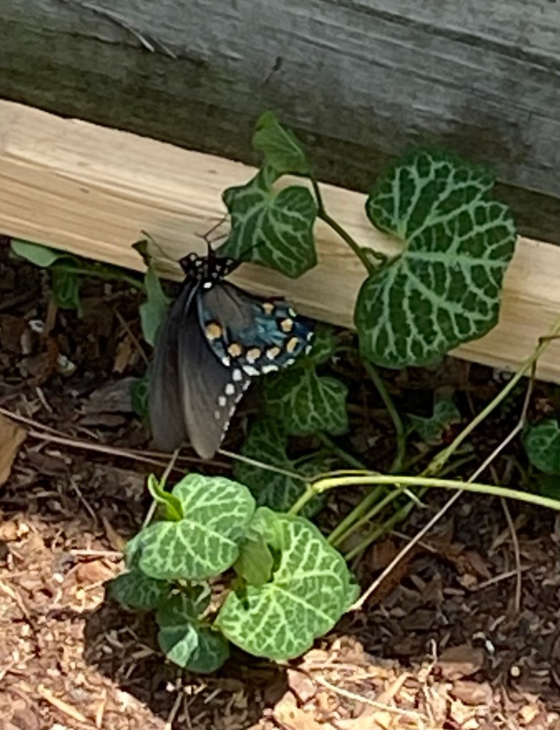 After raising a few generations of Monarch butterflies, we wanted to extend our butterfly rearing to other species. We noticed these pretty black and blue butterflies flying around our neighborhood and learned they were Pipevine swallowtail butterflies. The host plant is Pipevine. Baby caterpillars like to stay close together. (Strength in numbers!) Pipevine caterpillars are black with red spots. Their chrysalis hangs like a hammock and they can be green or brown (they can blend well against certain backgrounds). The boys have a beautiful blue hue on their hind wings while the girls are generally all black. Both have these pretty blue and orange markings on their backside.